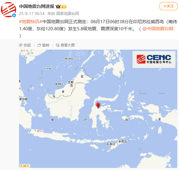 新京報訊 據中國地震臺網正式測定:08月17日06時38分在印尼蘇拉威西島(南緯1.40度,東經120.80度)發(fā)生5.8級地震,震源深度10千米。編輯 李憶林子 點贊 +1 微博 微信 我要評論 登錄 直播 預告 直播丨市民對話一把手:綜合施策治理非機動車亂停亂放 2025-10-27 19:30 預 告 2025京西古道100越野賽 2025-10-25 07:30 熱點 1 京城尋秋 | 香山紅葉蓄勢待發(fā),本周末起迎最佳觀賞期 2.3萬 2 祥源控股23億港元入主海昌海洋公園,近四成資金將用于還債 2.0萬 3 《藤野先生》還可以叫《重生之我在日本棄醫(yī)從文》? 1.8萬 4 周大生2.1億天價訴訟終審落槌,278萬賠償背后業(yè)績承壓 1.7萬 5 國際丨李在明:不能將中國拒之門外 中國企業(yè)在某些方面超越韓企 1.4萬 最新 重現“立國之戰(zhàn)”:紀念抗美援朝出國作戰(zhàn)75周年|重建現場 28分鐘前 東鵬飲料沖刺港股:爆品依賴癥待破解,海外收入占比低 36分鐘前 三季度貸款投向公布:貸款支持科創(chuàng)力度較大、消費貸款保持增長 36分鐘前 福耀科技大學聯手廈門大學培養(yǎng)碩士研究生,擬招35人 40分鐘前 到2027年,北京力爭實現年工業(yè)旅游收入達到30億元 42分鐘前 熱議 教育部發(fā)布10條措施,進一步加強中小學生心理健康工作 習近平將赴韓國出席亞太經合組織第三十二次領導人非正式會議并對韓國進行國事訪問 圖個明白丨戰(zhàn)力對比懸殊 75年前中國贏得這場戰(zhàn)爭有多難? 美國國家安全局網絡攻擊入侵中國國家授時中心,外交部回應 重現“立國之戰(zhàn)”:紀念抗美援朝出國作戰(zhàn)75周年|重建現場