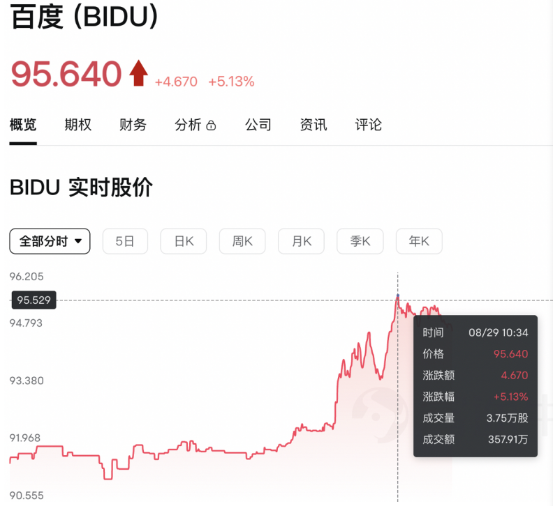 新京報貝殼財經(jīng)訊 8月29日,百度(BIDU)美股上漲超5%,表現(xiàn)顯著優(yōu)于大盤。