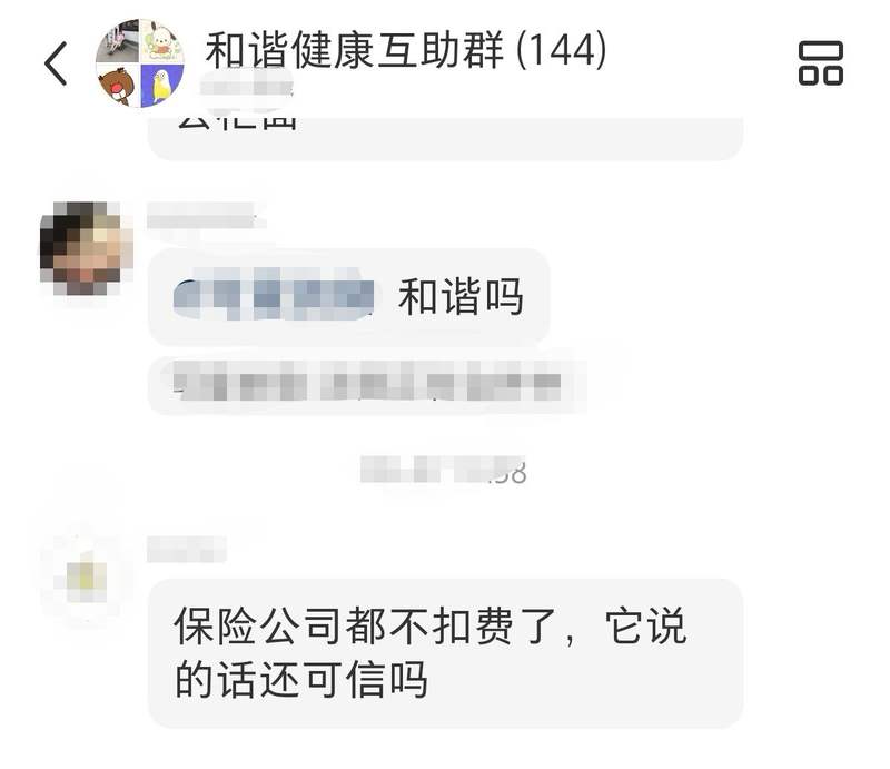 王芳續(xù)期保費扣費失敗并非個例。一個名為“和諧健康互助”的群已經(jīng)集結(jié)100多人。新京報貝殼財經(jīng)記者采訪了解到,一些和諧健康的客戶近期經(jīng)歷了扣費難,且主要集中在8月底至9月上旬,產(chǎn)品以重疾險為主。