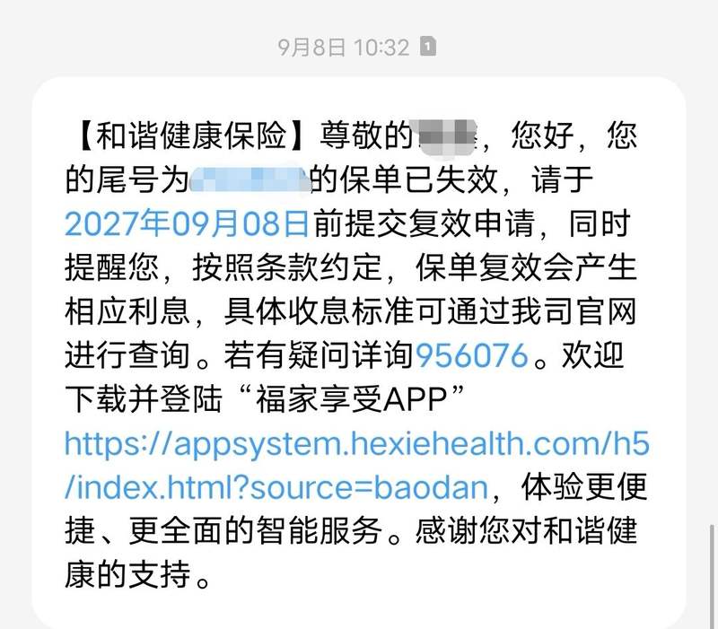 9月8日,王芳收到了和諧健康關(guān)于重疾險保單失效的短信提醒。