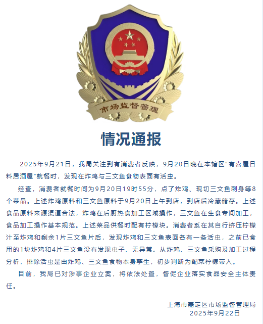 2025年9月21日,我局關(guān)注到有消費(fèi)者反映,9月20日晚在本轄區(qū)“有喜屋日料居酒屋”就餐時(shí),發(fā)現(xiàn)在炸雞與三文魚(yú)食物表面有活蟲(chóng)。