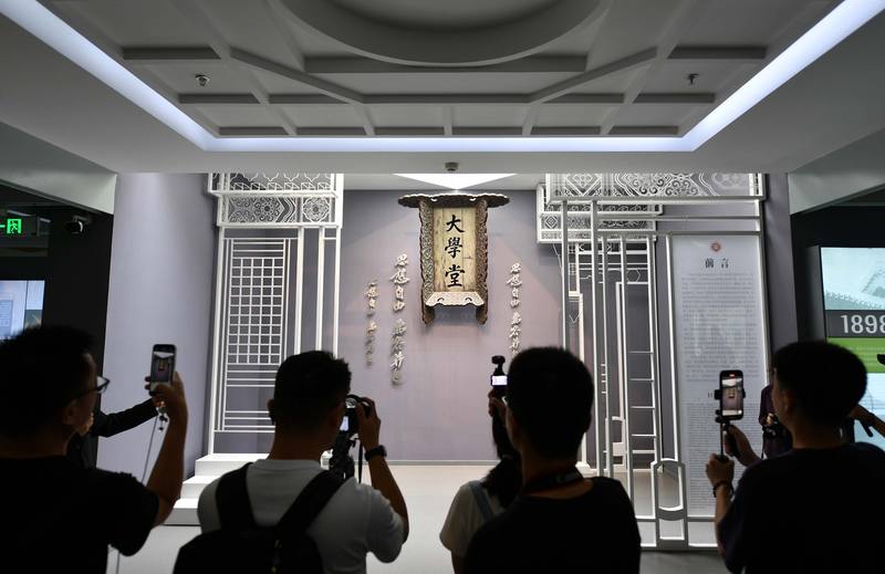 走入北京大學(xué)校史館地下二層的百年校史專題展,首先映入眼簾的是醒目的“大學(xué)堂”匾額。新京報(bào)記者 李木易 攝