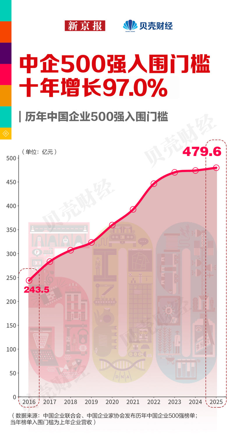 新京報(bào)貝殼財(cái)經(jīng)回顧歷史數(shù)據(jù)發(fā)現(xiàn),中國企業(yè)500強(qiáng)的入圍門檻已連續(xù)23年上升。從近10年數(shù)據(jù)看,其門檻從2016年的不足250億元,到如今逼近480億元,累計(jì)增幅高達(dá)97.0%。這意味著,企業(yè)若想進(jìn)入這份象征中國大企業(yè)競(jìng)爭(zhēng)力的榜單,其營收增長不僅需要順應(yīng)宏觀經(jīng)濟(jì)的發(fā)展大勢(shì),還必須保持比競(jìng)爭(zhēng)者更快的擴(kuò)張速度。