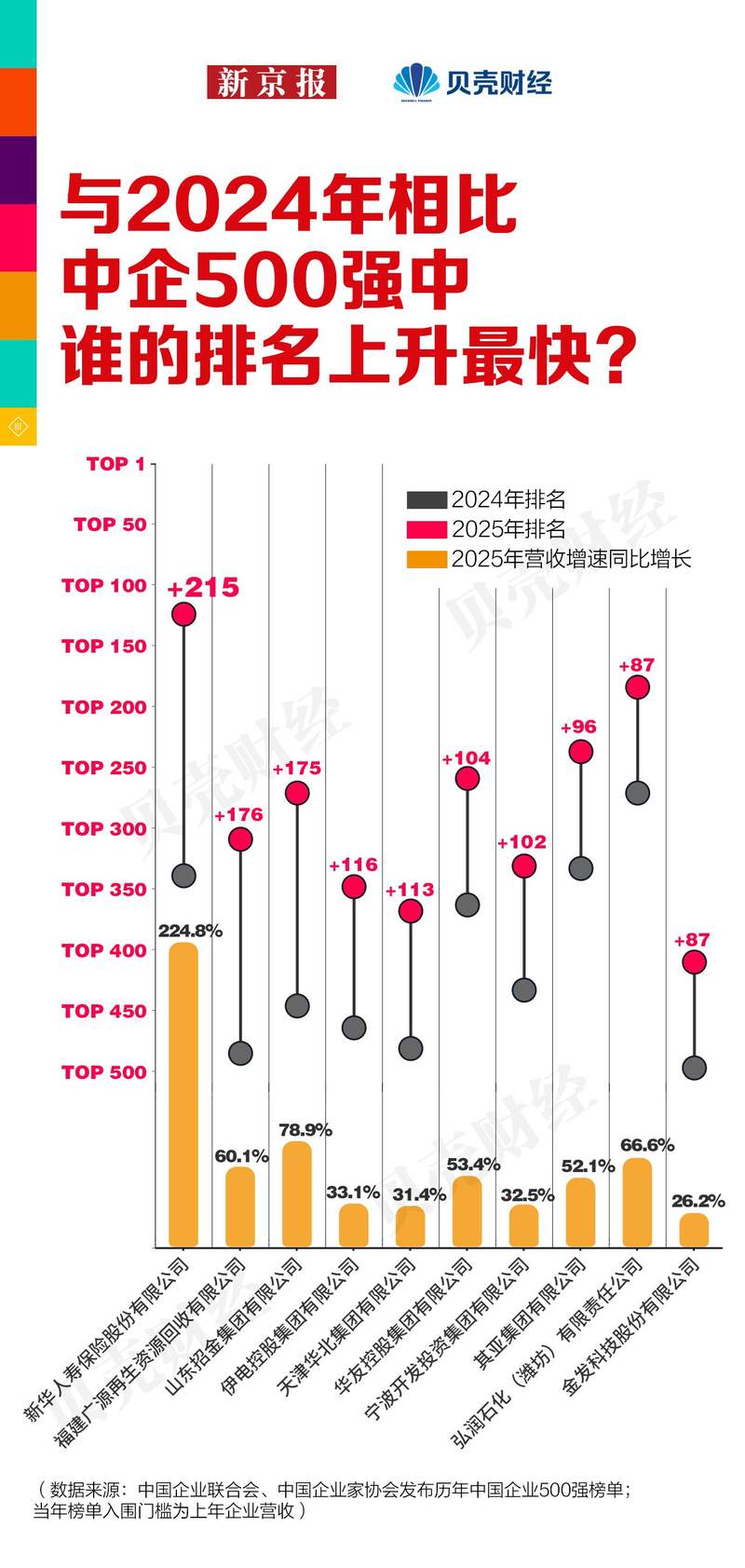 根據(jù)2025年的榜單,部分企業(yè)排名分化顯著。上升最快的新華人壽憑借營收同比高達(dá)224.8%的增長,較上年提升215個位次,成為今年最大黑馬,壽險板塊在行業(yè)周期調(diào)整后強(qiáng)力反彈。山東招金集團(tuán)、弘潤石化、華友控股等企業(yè)也依托行業(yè)景氣度回升或產(chǎn)業(yè)鏈優(yōu)勢,實現(xiàn)超過50%的營收增幅,帶動排名大幅躍升,資源品與能源相關(guān)產(chǎn)業(yè)在行情向好時放大效應(yīng)明顯。