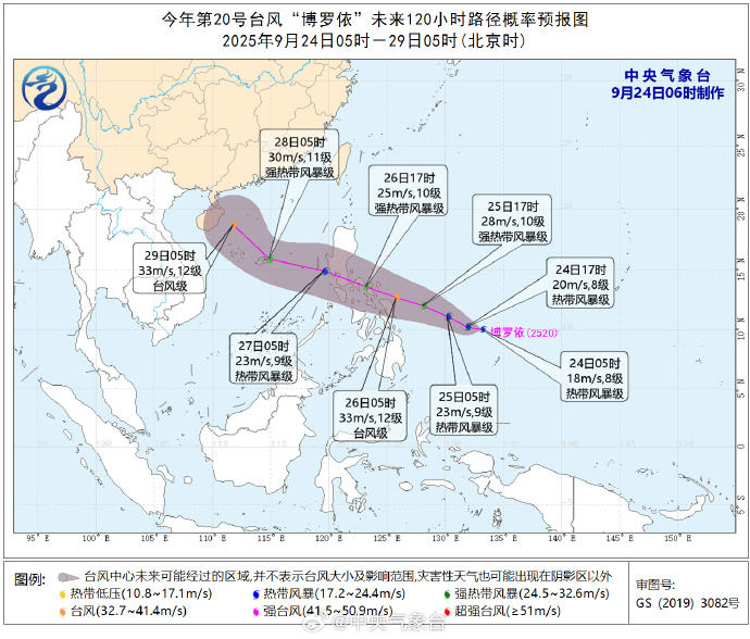 新京報訊 據(jù)@中央氣象臺 消息,24日早晨5點鐘,今年第20號臺風(fēng)“博羅依”(熱帶風(fēng)暴級;英文名稱:Bualoi;名字來源:泰國;名稱意義:一種泰式甜品)在菲律賓以東洋面生成。預(yù)計27日它將進(jìn)入南海東部海域,之后向西北方向移動,強度有所增強。