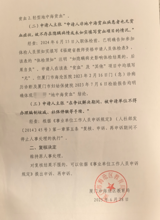 6月28日,廈門海滄區(qū)教育局作出復(fù)核結(jié)果。 受訪者供圖