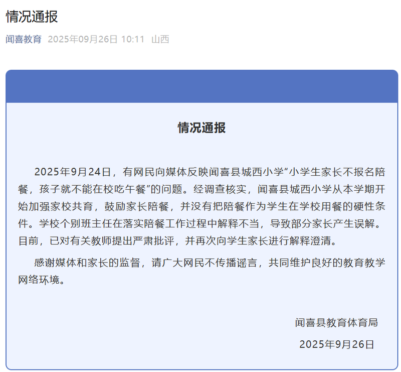新京報訊 9月26日,聞喜縣教育體育局發(fā)布情況通報,2025年9月24日,有網(wǎng)民向媒體反映聞喜縣城西小學“小學生家長不報名陪餐,孩子就不能在校吃午餐”的問題。經(jīng)調(diào)查核實,聞喜縣城西小學從本學期開始加強家校共育,鼓勵家長陪餐,并沒有把陪餐作為學生在學校用餐的硬性條件。學校個別班主任在落實陪餐工作過程中解釋不當,導(dǎo)致部分家長產(chǎn)生誤解。目前,已對有關(guān)教師提出嚴肅批評,并再次向?qū)W生家長進行解釋澄清。