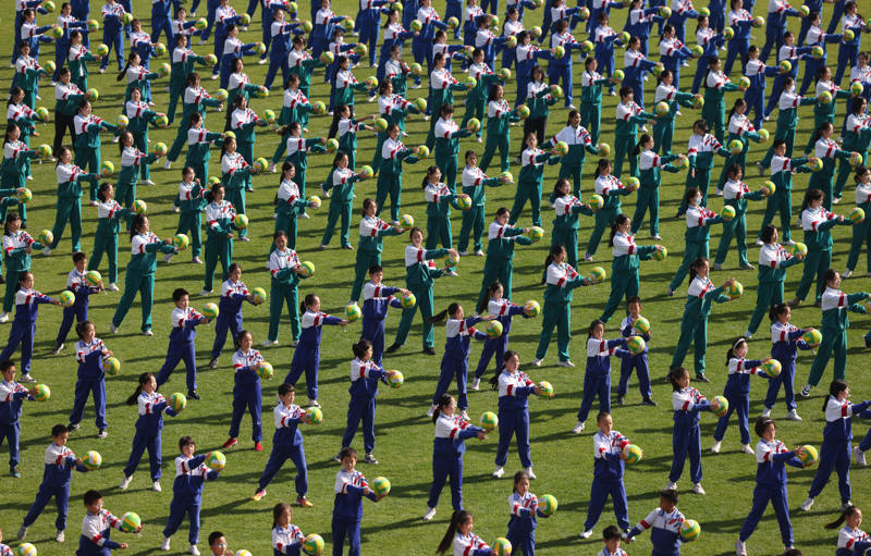 千人排球操展示中,不同年級(jí)的學(xué)生手持排球,畫面十分壯觀。新京報(bào)記者 李木易 攝