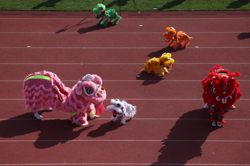體育節(jié)開幕式上,機(jī)械狗變成“小獅子”,與舞獅隊(duì)一起表演。新京報(bào)記者 李木易 攝