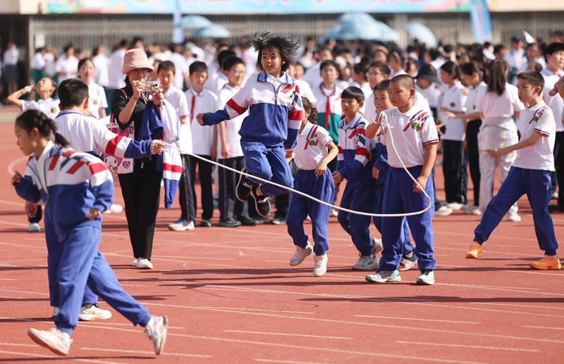 體育節(jié)開啟,學(xué)生們?cè)谶M(jìn)行跳長繩比賽。新京報(bào)記者 李木易 攝