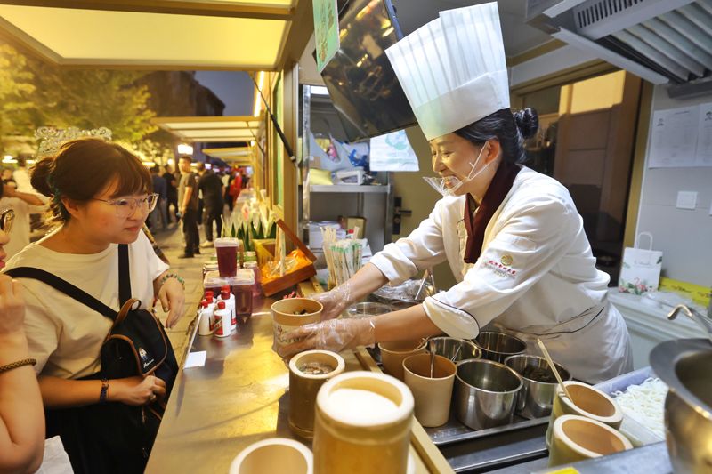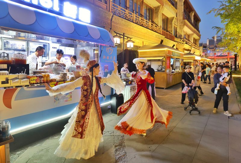 9月26日,首屆“前門-中華美食薈”開幕儀式在北京前門正陽(yáng)門廣場(chǎng)舉行。活動(dòng)深度整合各地駐京辦特色美食與文化資源,打造一場(chǎng)高品質(zhì)、廣參與、促消費(fèi)的美食文化盛宴,是東城區(qū)落實(shí)國(guó)際消費(fèi)中心城市示范區(qū)建設(shè),提升區(qū)域消費(fèi)能級(jí)的創(chuàng)新實(shí)踐。圖為新疆美食展位前的舞蹈表演。