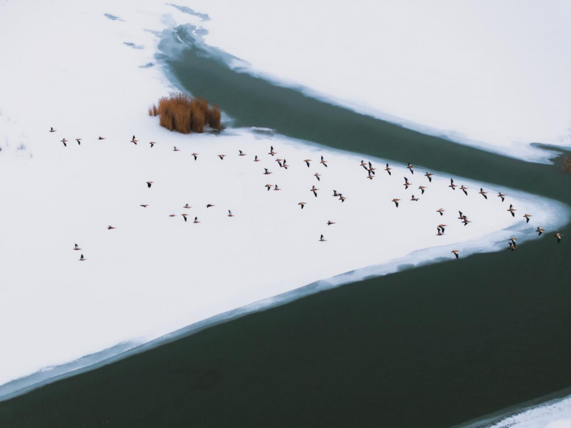 博斯騰湖水域被凍結(jié),群鳥掠過湖面,飛往春天。文興華/攝