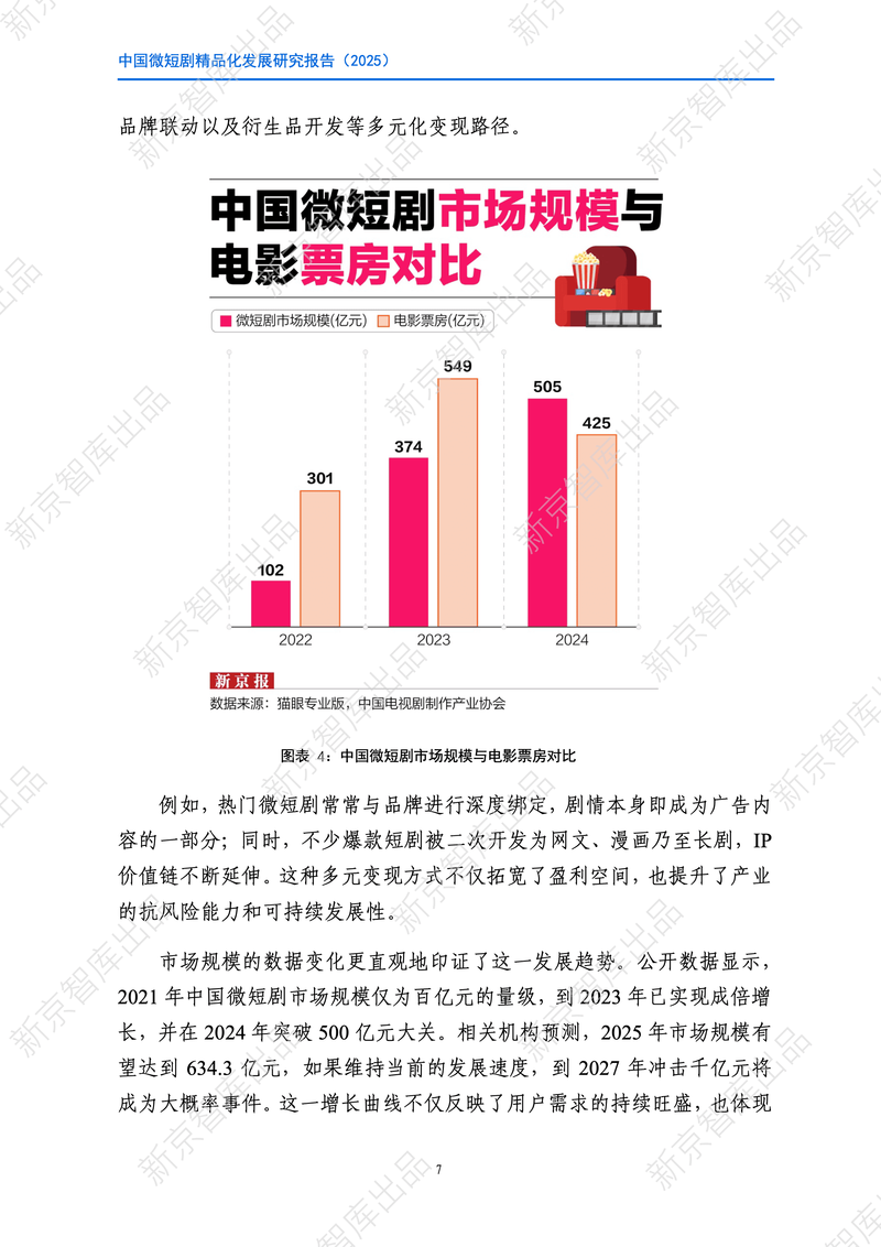 隨著用戶規(guī)模的持續(xù)擴大與產(chǎn)業(yè)鏈條的逐步成熟,微短劇在短短數(shù)年間實現(xiàn)了從“野蠻生長”到“精品化轉(zhuǎn)型”的跨越。截至2025年6月,中國微短劇用戶已接近7億,市場規(guī)模突破500億元,預計2025年將達到634.3億元,甚至在2027年有望沖擊千億關口 。這一規(guī)模不僅與中國電影票房相當,更使微短劇成為網(wǎng)絡文藝中的重要支柱產(chǎn)業(yè)。伴隨平臺資本的深度參與和政策體系的不斷完善,行業(yè)逐漸形成了從劇本孵化、拍攝制作、分發(fā)傳播到商業(yè)變現(xiàn)的全鏈條生態(tài),精品化成為新的發(fā)展趨勢。