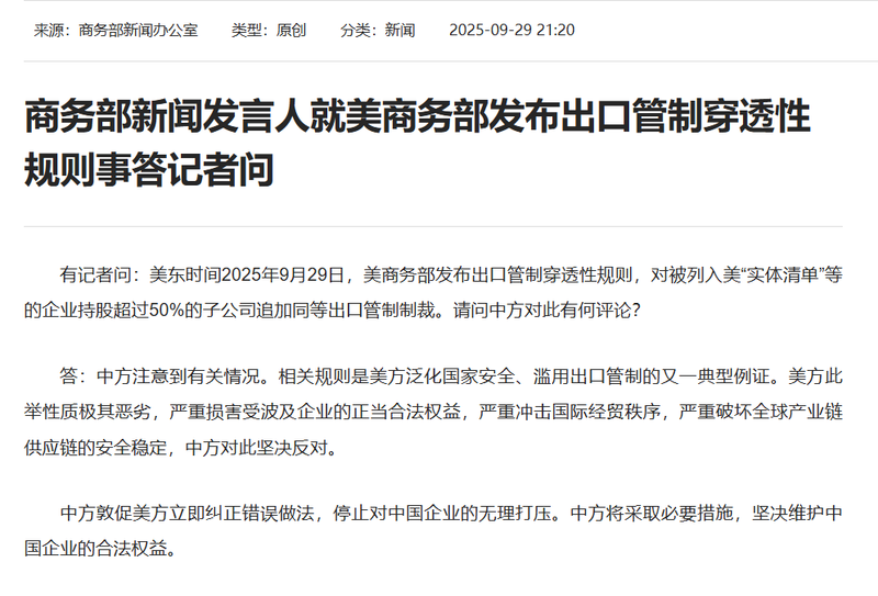 有記者問:美東時(shí)間2025年9月29日,美商務(wù)部發(fā)布出口管制穿透性規(guī)則,對(duì)被列入美“實(shí)體清單”等的企業(yè)持股超過50%的子公司追加同等出口管制制裁。請(qǐng)問中方對(duì)此有何評(píng)論?