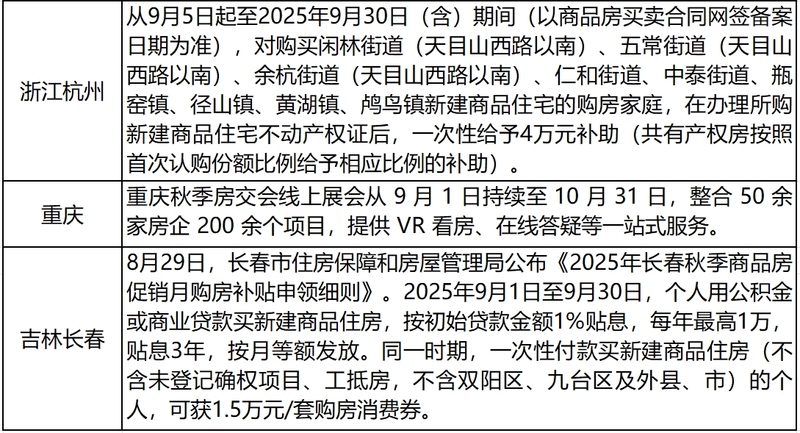 房展會(huì)成為線下引流的重要載體。比如,重慶秋季房交會(huì)線上展會(huì)從9月1日持續(xù)至10月31日,整合50余家房企200余個(gè)項(xiàng)目;河南則計(jì)劃在年底前舉辦不少于100場(chǎng)房展會(huì);吉林省延吉市于9月20日至10月31日舉辦2025年秋季房交會(huì),除企業(yè)自主推出的“購房立減”等福利外,政府對(duì)購買新建商品房的群眾按照每平方米補(bǔ)貼500元、最高補(bǔ)貼5萬元。