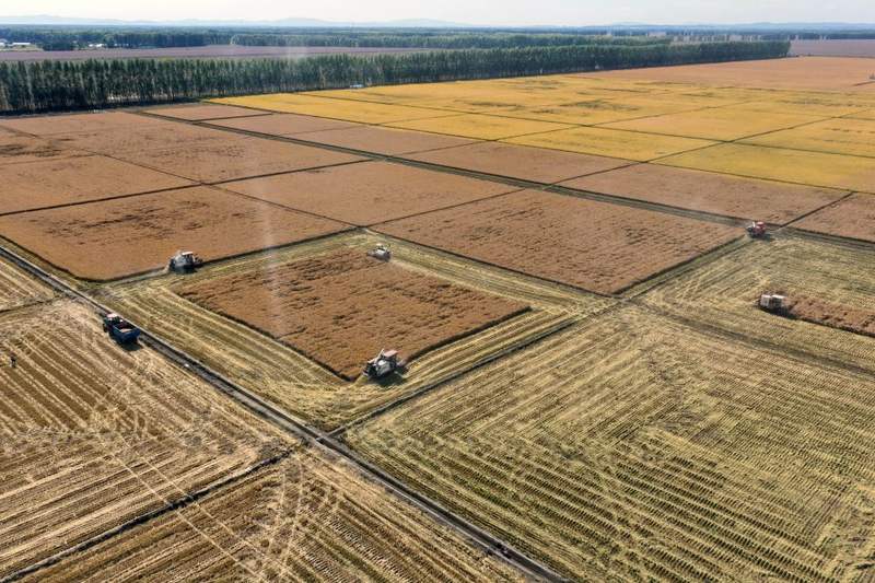2025年9月23日,在黑龍江北大荒農(nóng)業(yè)股份有限公司友誼分公司一水田地塊,大型農(nóng)業(yè)機(jī)械在進(jìn)行水稻收獲作業(yè)(無(wú)人機(jī)照片)。 新華社記者 王松 攝