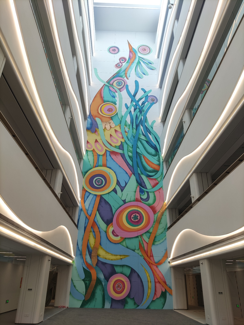 據楊莉介紹,這幅“筑巢引鳳”畫作從4層一直貫穿到10層,“大家可以看到,它是沒有畫眼睛的,因為我們覺得創(chuàng)新本來就是一個探索的過程,它充滿未知,但是令人向往,看見未看見,改變未改變,大家都走在未來可期的路上,而我們公司會陪伴著大家一起探索,一路同行。”