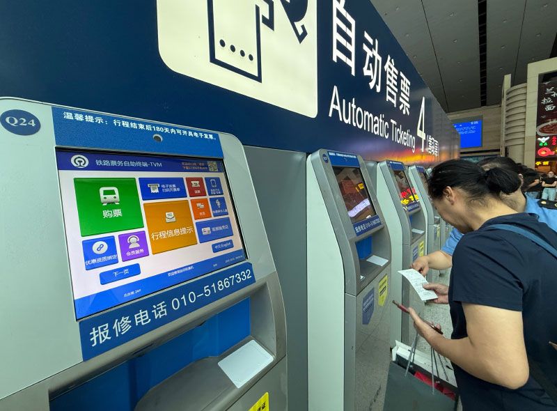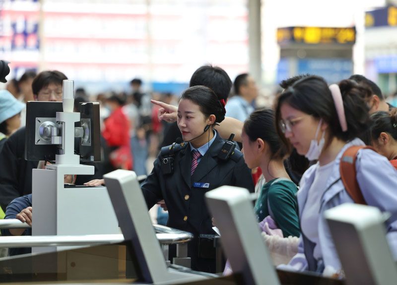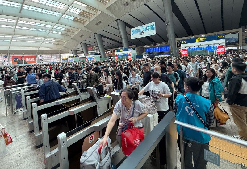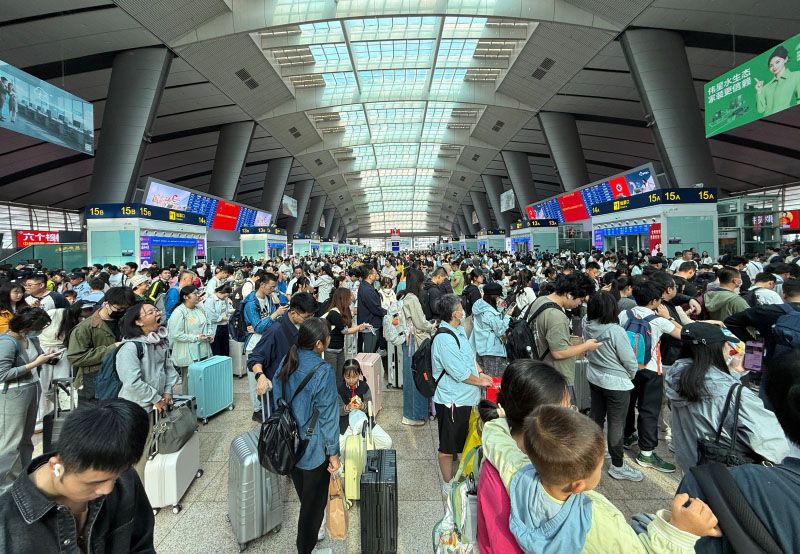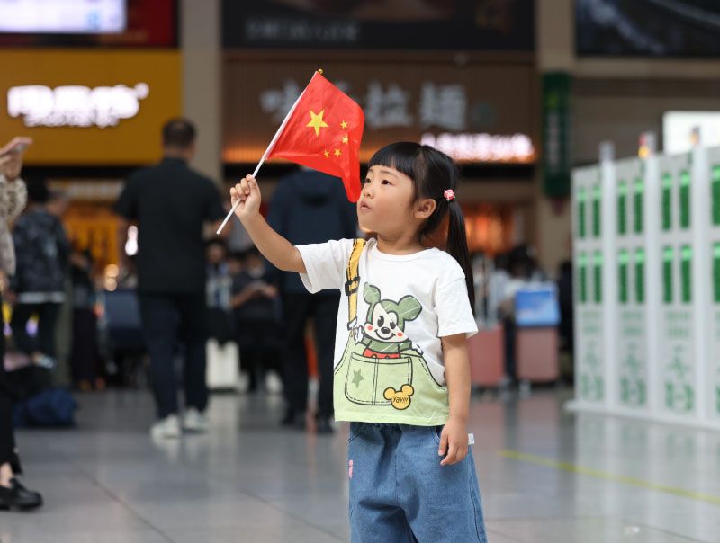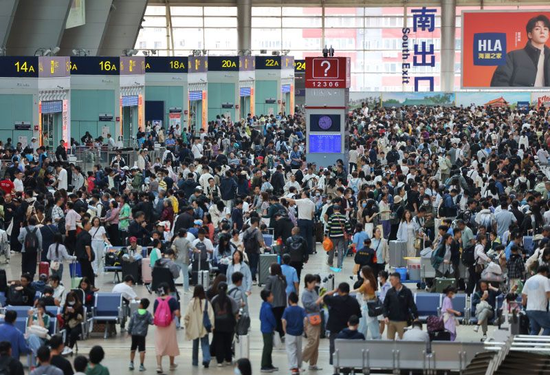 10月1日,北京各大火車站迎來客流高峰。鐵路部門數(shù)據顯示,10月1日北京地區(qū)預計發(fā)送旅客89.3萬人次、到達旅客61.4萬人次。圖為:北京南站候車大廳,旅客排隊檢票。