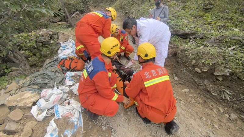 救援人員用擔(dān)架將老人抬下山。懷柔消防供圖