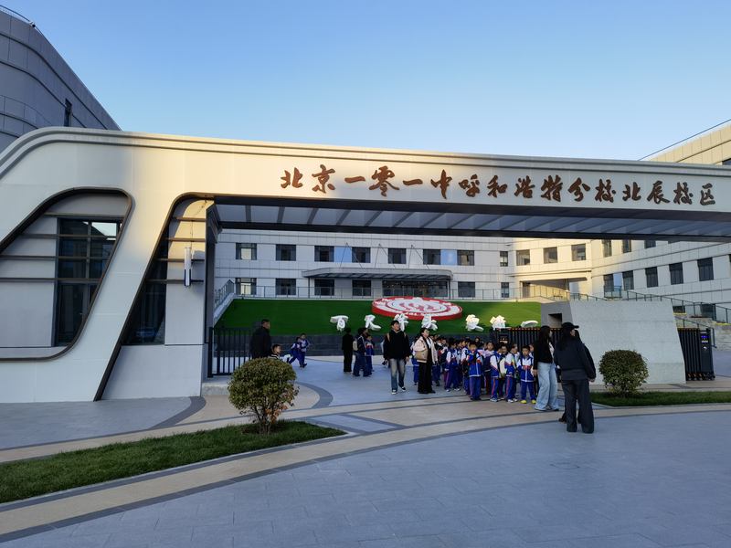 9月23日下午五點(diǎn)多,呼和浩特新城區(qū)的一所學(xué)校,小學(xué)生們正排隊(duì)放學(xué),這是北京一零一中在內(nèi)蒙古新建分校中的一座新校區(qū),全名為北京一零一中呼和浩特分校北辰校區(qū)。嶄新的大樓呈流線(xiàn)型建設(shè),教學(xué)樓、圖書(shū)館、體育館、教研室等連在一起,校舍外大片的操場(chǎng)鋪滿(mǎn)綠蔭,二樓的連廊,連通了大片空間,更像一片空中的操場(chǎng),連廊上有空地、圖書(shū)角、休息區(qū),可以供師生們?cè)谶@里讀書(shū)、休憩,站在連廊上,不必下樓,藍(lán)天白云、綠草原野就撲面而來(lái),撞入眼瞼。