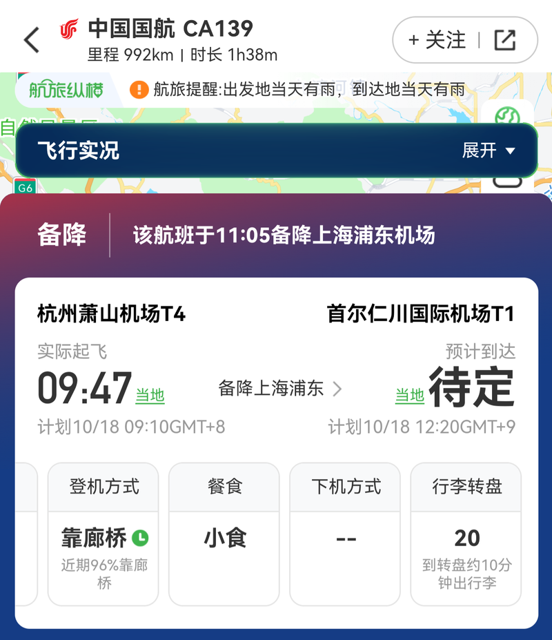 10月18日,CA139航班11時(shí)5分備降上海浦東國(guó)際機(jī)場(chǎng)。航旅縱橫APP截圖