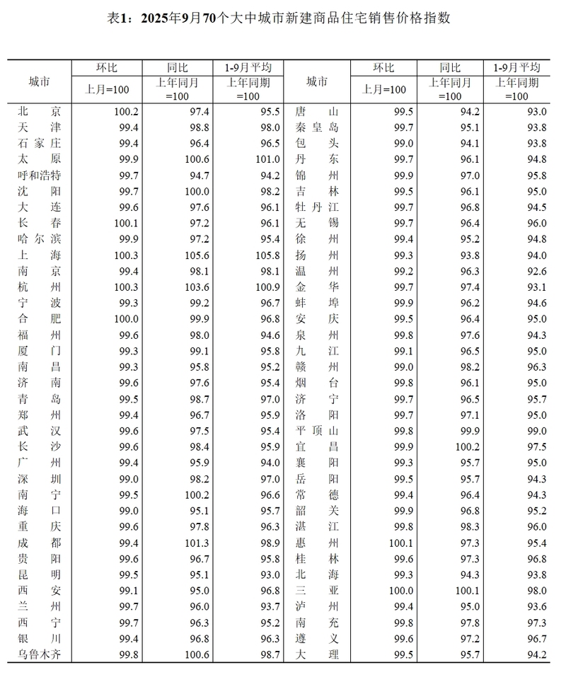 在傳統(tǒng)銷售旺季“金九”,全國各大城市房價走勢如何?10月20日,國家統(tǒng)計局發(fā)布2025年9月份70個大中城市商品住宅銷售價格變動情況。國家統(tǒng)計局城市司首席統(tǒng)計師王中華解讀:“9月份,70個大中城市中,各線城市商品住宅銷售價格環(huán)比下降,同比降幅繼續(xù)呈收窄態(tài)勢。”