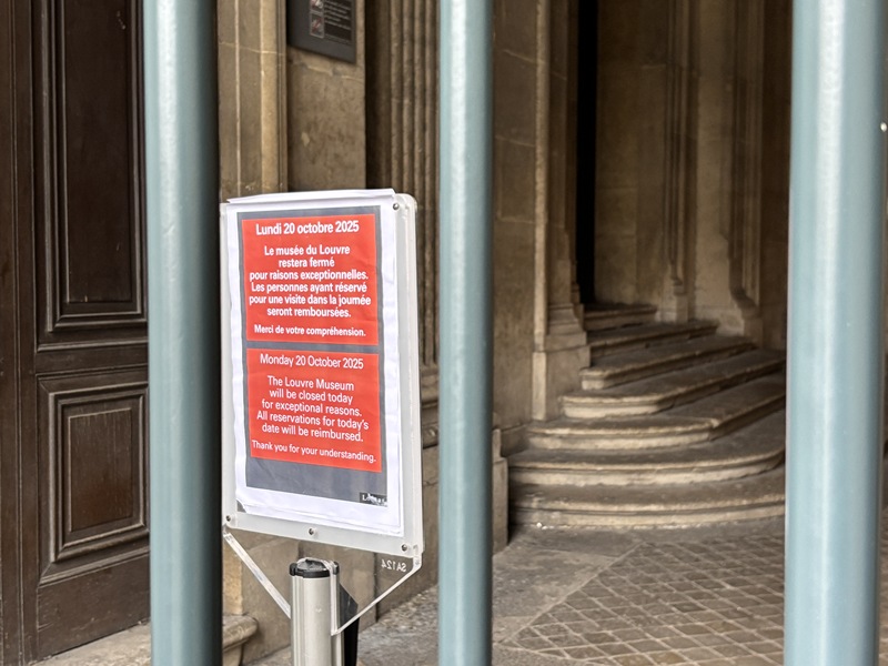 當(dāng)?shù)貢r(shí)間10月20日,盧浮宮現(xiàn)場(chǎng)豎起了“因特殊原因關(guān)閉”的告示牌。 劉暢 攝
