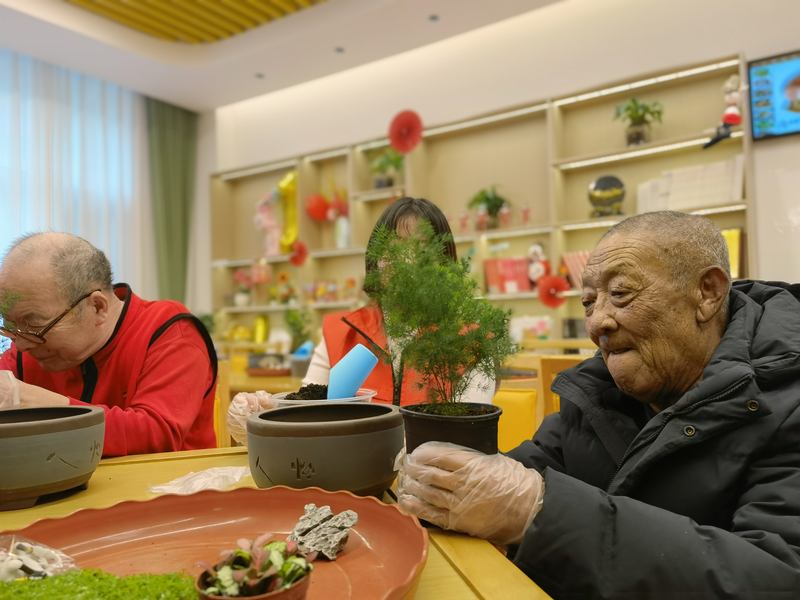 一棵蓬萊松、一簇網(wǎng)紋草、一塊石頭、幾個(gè)仙鶴小模型……10月24日,北京市豐臺(tái)區(qū)北宮鎮(zhèn)養(yǎng)老服務(wù)中心,一間手工室內(nèi),十多位老人齊聚一堂,在手工老師的帶領(lǐng)下,自己動(dòng)手,在花盆中栽花、填土、裝飾花盆,做一盆屬于自己的獨(dú)特綠植。