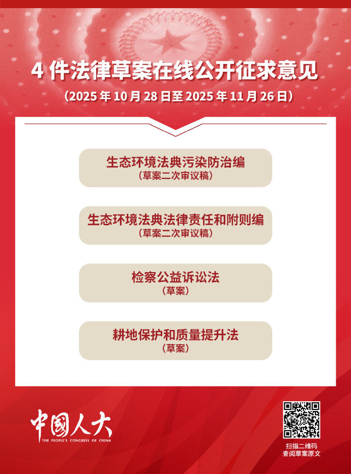新京報訊 據(jù)全國人大消息,今天起,4件法律草案公開征求意見,截止日期為2025年11月26日。