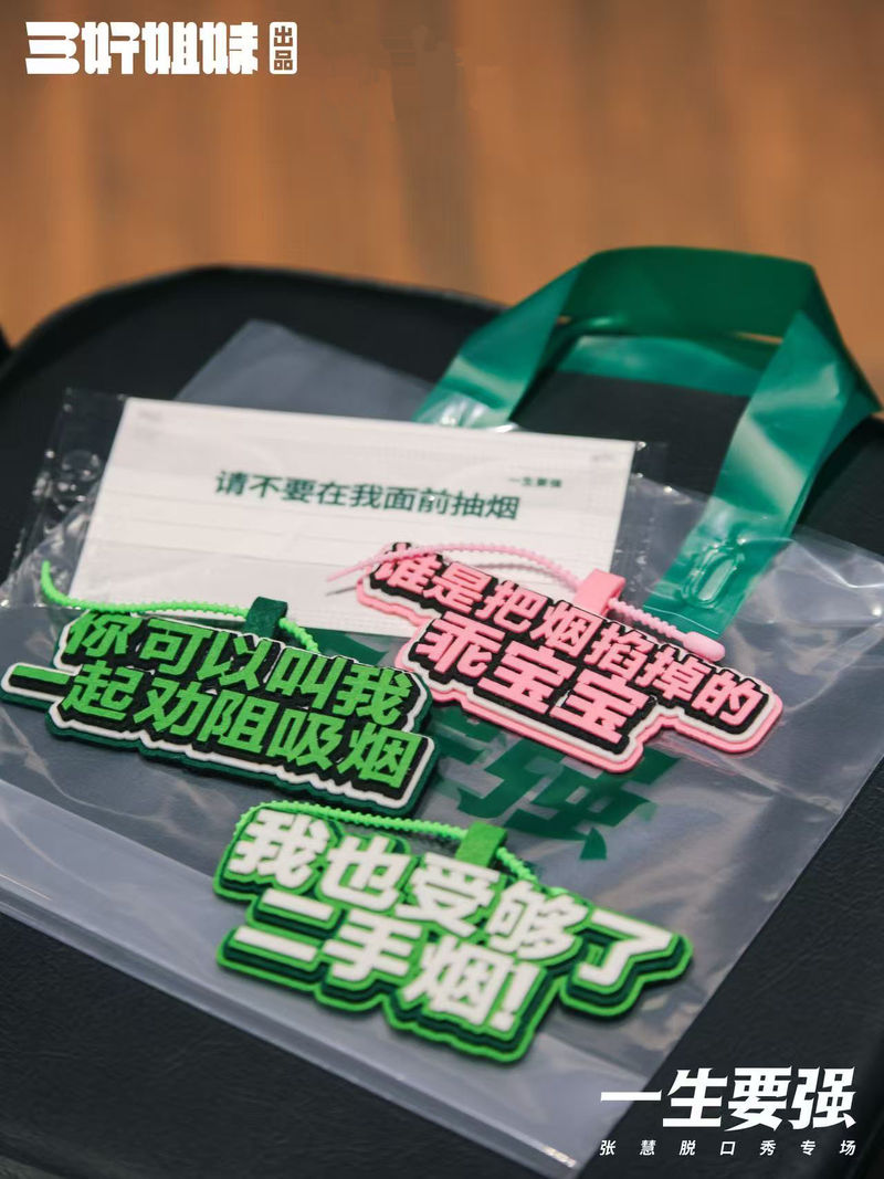 此次專場的一大亮點(diǎn),是與中國青年網(wǎng)聯(lián)手打造的控?zé)煿姝h(huán)節(jié)。張慧團(tuán)隊為專場定制了印制勸阻吸煙標(biāo)語的掛件、禁煙主題口罩周邊。