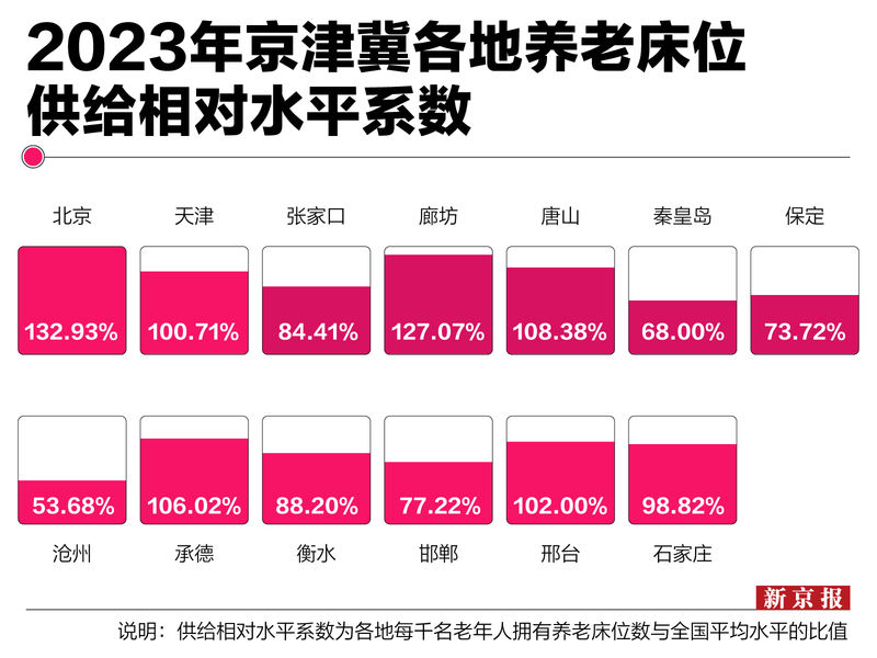從養(yǎng)老服務(wù)供給水平來(lái)看,京津冀13個(gè)城市的每千名老年人(65歲及以上)擁有養(yǎng)老床位數(shù)的平均供給相對(duì)水平系數(shù)為93.9%,接近全國(guó)平均水平。其中,北京、天津,廊坊、唐山、承德和邢臺(tái)等6個(gè)城市的每千名老年人床位數(shù)達(dá)到或超過(guò)全國(guó)平均水平(23.86張/千人)。供給相對(duì)水平系數(shù)是將各地每千名老年人擁有床位數(shù)與全國(guó)平均水平進(jìn)行對(duì)比,計(jì)算公式為供給相對(duì)水平系數(shù)=各地每千名老年人擁有床位數(shù)÷全國(guó)每千名老年人擁有床位數(shù)。