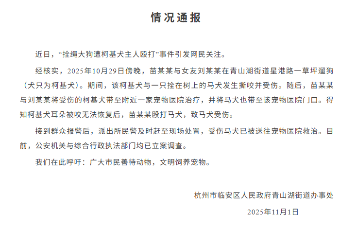 新京報訊 11月1日,杭州市臨安區(qū)人民政府青山湖街道辦事處發(fā)布情況通報,近日,“拴繩大狗遭柯基犬主人毆打”事件引發(fā)網(wǎng)民關(guān)注。