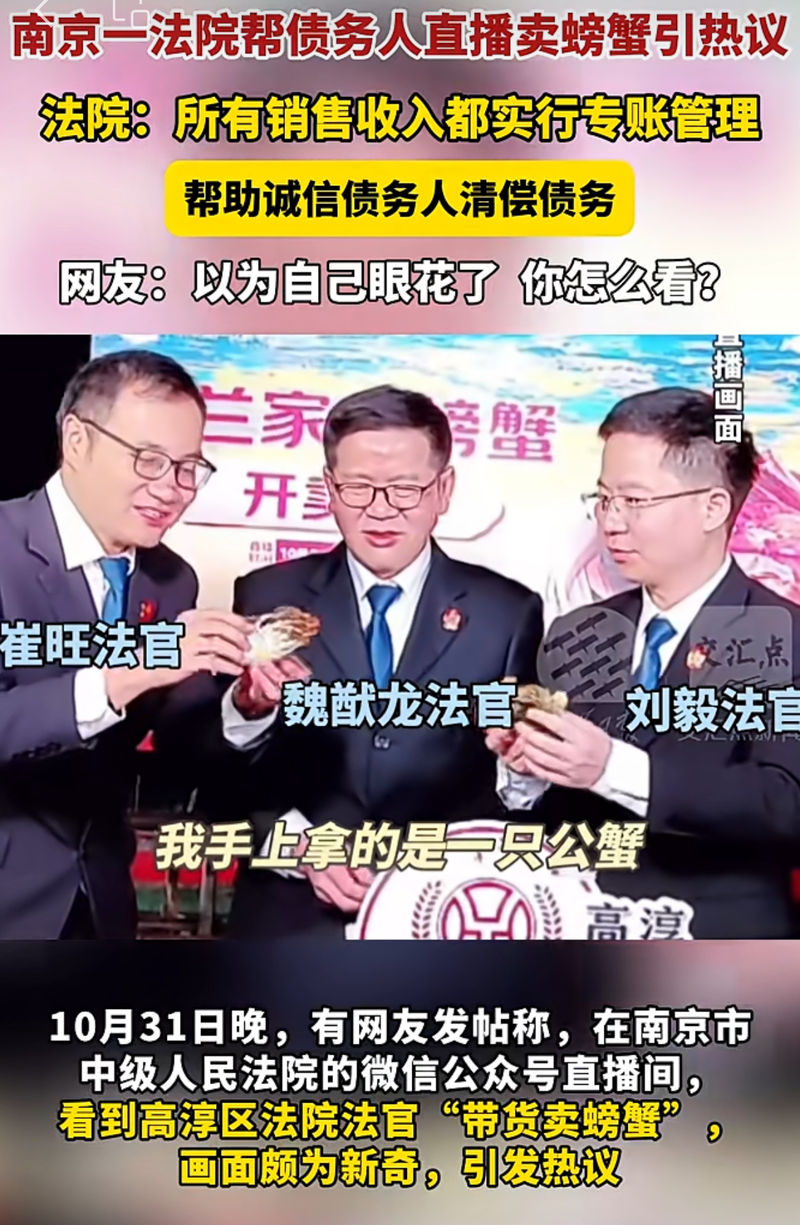 據(jù)報(bào)道,10月31日晚,南京市高淳區(qū)人民法院聯(lián)合京東資產(chǎn)交易平臺(tái)舉辦司法變賣直播,三位身著制服的執(zhí)行干警化身“主播”,幫助誠信債務(wù)人秋蘭一家在線銷售螃蟹,成功吸引超20萬人次圍觀,引發(fā)廣泛關(guān)注。11月1日,高淳區(qū)人民法院執(zhí)行局回應(yīng),系執(zhí)行工作新嘗試,收入實(shí)行專賬管理。
