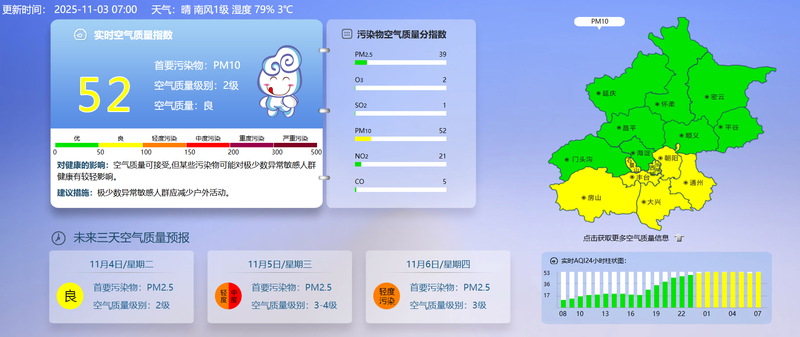 據(jù)北京市生態(tài)環(huán)境監(jiān)測中心今早7時數(shù)據(jù),目前實時空氣質(zhì)量指數(shù)52,空氣質(zhì)量良。