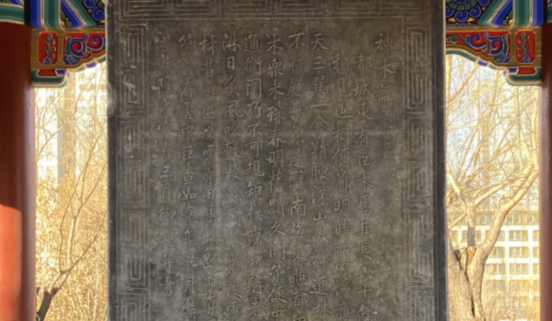 在公園里穿行的時候,看到通惠河邊有一棵五百年歷史的大槐樹,據(jù)說曹雪芹在香山和通縣之間走動,經(jīng)常在此樹下等船、歇息,或與朋友聊天,此樹便被人稱為“文槐”。要不是因?yàn)闃渲車隽舜u臺,我一定會伸手去摸它一摸,沾沾樹上的文氣。但這座公園里最大的寶貝還是乾隆皇帝的“神木詩碑”,所以我們未作停留便繼續(xù)向前,而不遠(yuǎn)處就看到了一座華美的碑亭,掩映在林木中。碑就端端正正地立在里面。