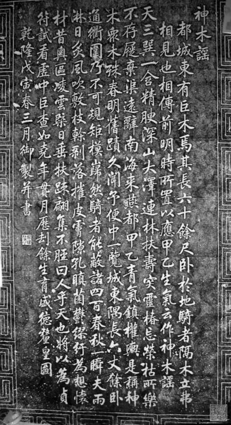 “神木詩碑”高有2米左右,置于亭子中間,我們只能在門欄外觀看,但仍然很震撼。碑的材質(zhì)堅(jiān)硬,雕刻精美,正面刻的是《神木行》,背面刻的是《神木謠》,乾隆的兩首詩均在這塊碑上,整個碑體保存完好。