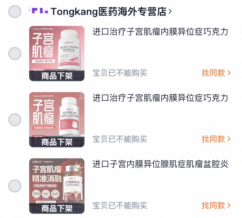 Tongkang醫(yī)藥海外專營店4款宣稱可以讓子宮肌瘤脫落的產(chǎn)品已下架。