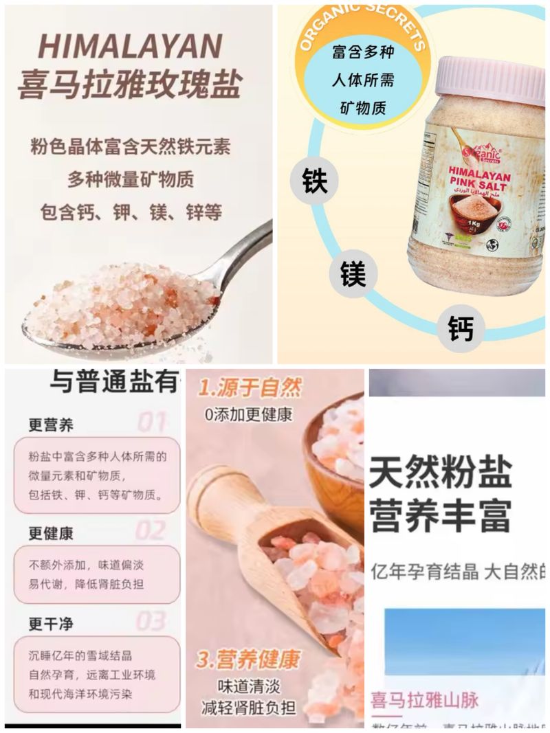 在報道刊發(fā)后,記者觀察到,不少電商平臺店鋪對“玫瑰鹽”的“健康功效”描述有所減少,但仍有不少店鋪以“富含礦物質(zhì)”“富含微量元素”“天然無添加”“更營養(yǎng)”等宣傳語暗示其“健康功效”。例如“Organic Secrets官方旗艦店”銷售的一款喜馬拉雅玫瑰鹽,宣傳頁面宣稱“富含多種人體所需的礦物質(zhì)”“鹽選好物,健康首選”;還有跨境電商平臺店鋪“有機物語”,在宣傳一款“玫瑰鹽”時,稱該粉鹽富含多種人體所需的微量元素和礦物質(zhì),包括鐵、鉀、鈣等,還宣稱“不額外添加,味道偏淡,易代謝,降低腎臟負(fù)擔(dān)”。