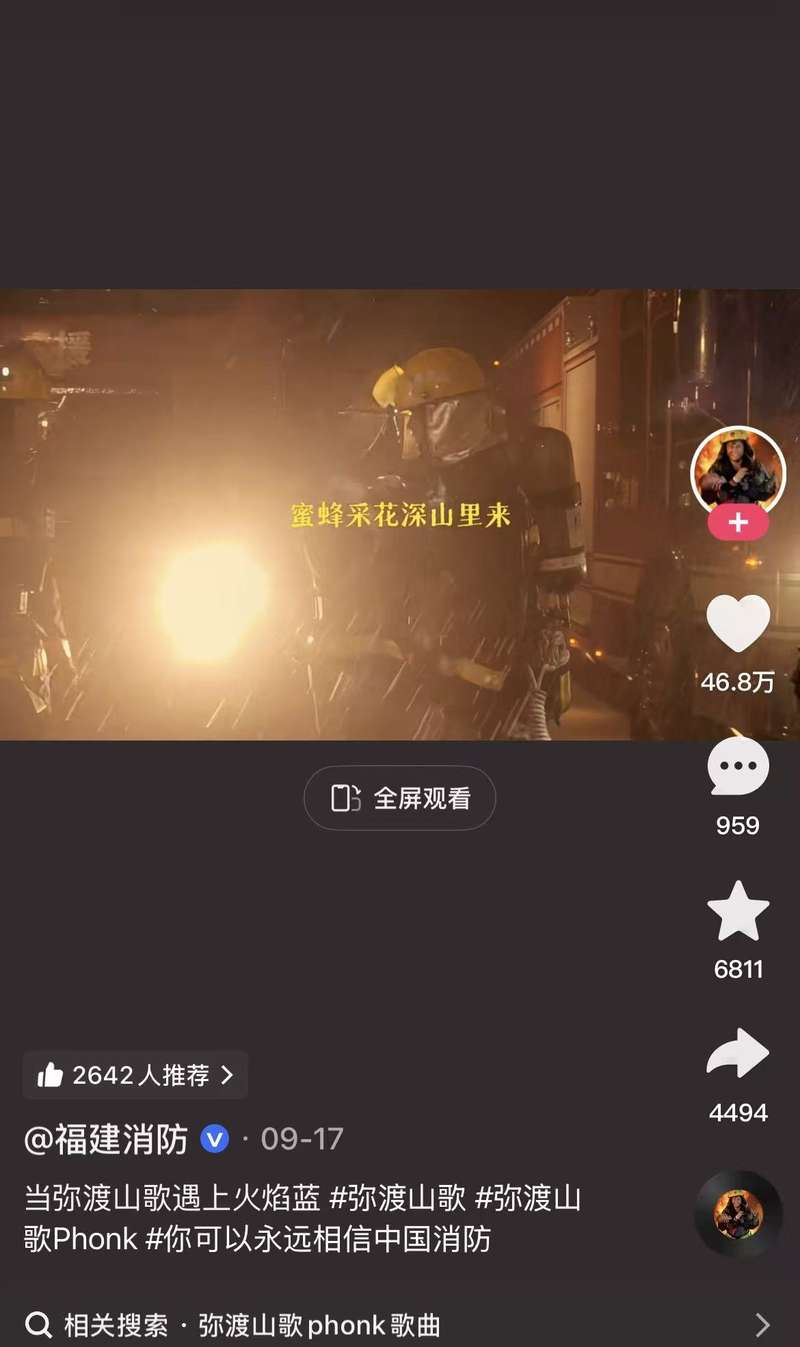 9月8日,快手音樂與制作人羊音樂攜手推出《彌渡山歌(PHONK)》。當(dāng)月恰逢中國人民抗日戰(zhàn)爭暨世界反法西斯戰(zhàn)爭勝利80周年 ,一句“蜜蜂本為采花死,梁山伯為祝英臺(tái)”的歌詞穿越算法無意中擊中了短視頻平臺(tái)用戶依然高漲的民族情感。這首歌頻繁出現(xiàn)在閱兵儀式、軍藝表演等相關(guān)短視頻中,甚至一度成為四川、福建等各地消防官方賬號(hào)視頻BGM(背景音樂)“新寵”,讓它們自發(fā)打出“彌渡山歌遇上火焰藍(lán)”這一話題詞。10月,快手站內(nèi)涌現(xiàn)了說唱改編版《彌渡山歌(PHONK)》,老鐵對(duì)中式PHONK的熱情繼續(xù)被點(diǎn)燃。