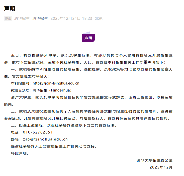 新京報(bào)訊 據(jù)清華招生微信公眾號(hào)消息,近日,清華大學(xué)招生辦公室接到多所中學(xué)、家長(zhǎng)及學(xué)生反映,有部分機(jī)構(gòu)與個(gè)人冒用學(xué)校名義開(kāi)展招生宣講,散布不實(shí)招生政策,造成不良社會(huì)影響。為此,清華大學(xué)招生辦公室就本科招生相關(guān)工作鄭重聲明如下: