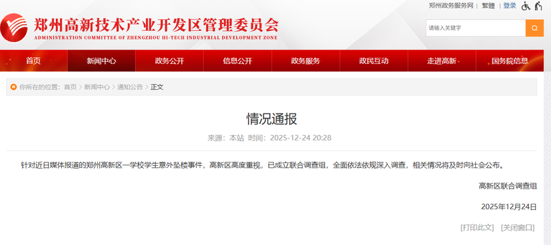 新京報訊 12月24日,高新區(qū)聯(lián)合調查組發(fā)布情況通報:針對近日媒體報道的鄭州高新區(qū)一學校學生意外墜樓事件,高新區(qū)高度重視,已成立聯(lián)合調查組,全面依法依規(guī)深入調查,相關情況將及時向社會公布。
