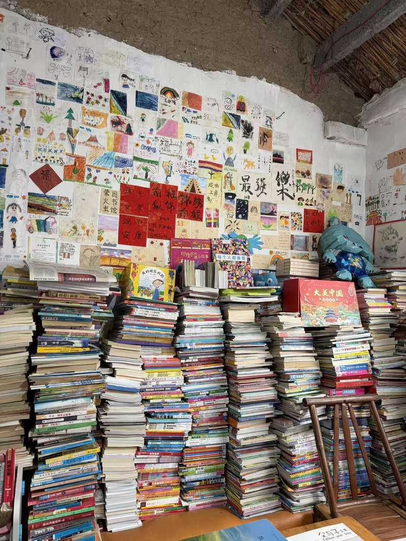圖書(shū)館內(nèi)沒(méi)有書(shū)架,9000余本書(shū)籍靠墻疊放。墻上是孩子們的畫(huà)作。 新京報(bào)記者 咸運(yùn)禎 攝
