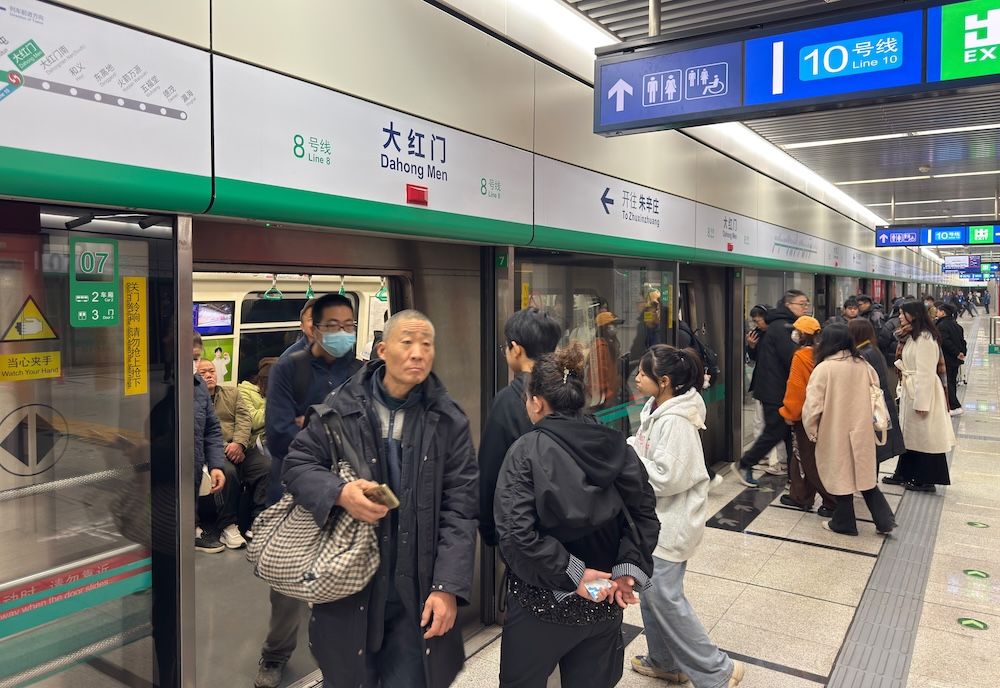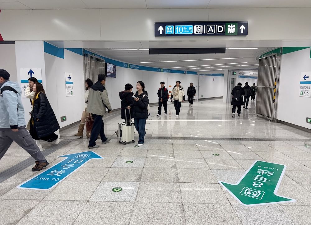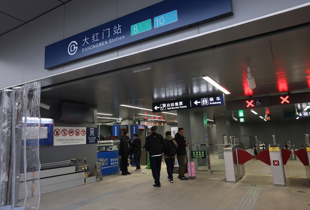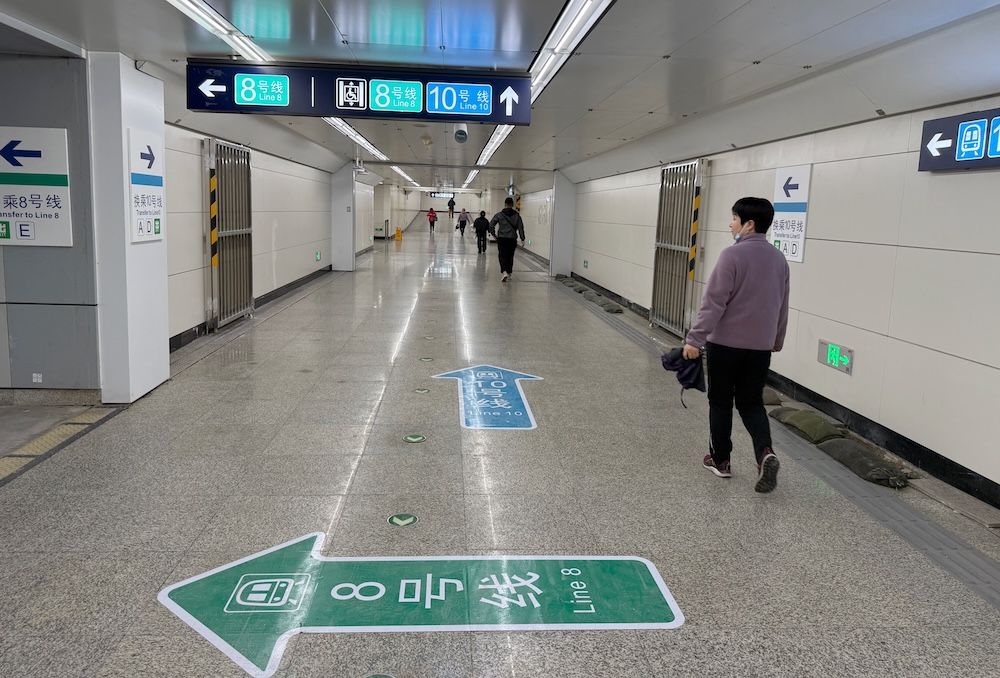 從今日(11月8日)首班車起,北京地鐵8號(hào)線大紅門站正式開通啟用,并實(shí)現(xiàn)與10號(hào)線的換乘。大紅門站內(nèi)設(shè)置有兩條換乘通道,一條較近的是在站廳內(nèi)建設(shè)的雙向換乘通道,另一條較遠(yuǎn)的是利用既有10號(hào)線C口通道內(nèi)建設(shè)的換乘通道。記者實(shí)地體驗(yàn)較近路線后發(fā)現(xiàn),換乘僅需2分鐘。