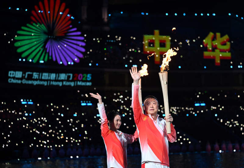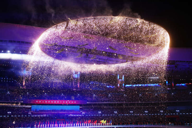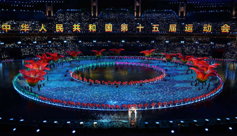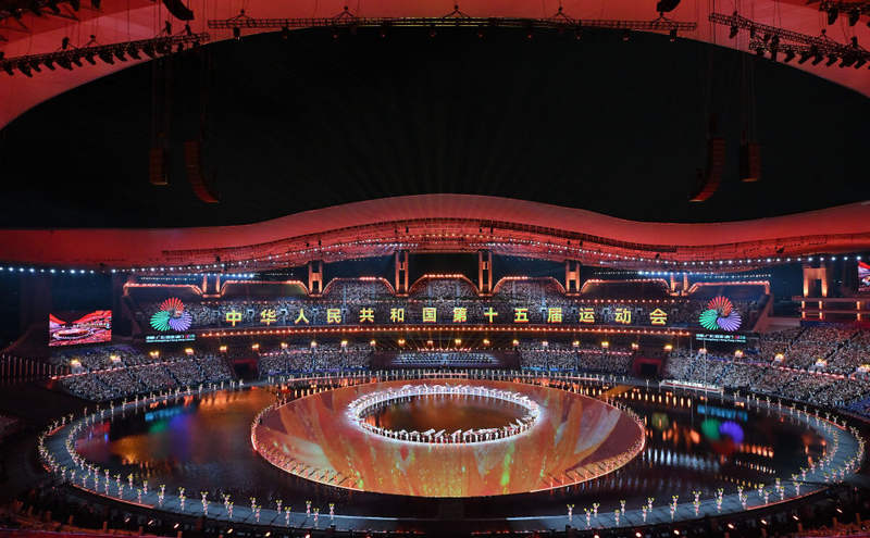 旗手護送中華人民共和國運動會會旗和第十五屆全國運動會會旗入場。新華社記者 盧漢欣 攝