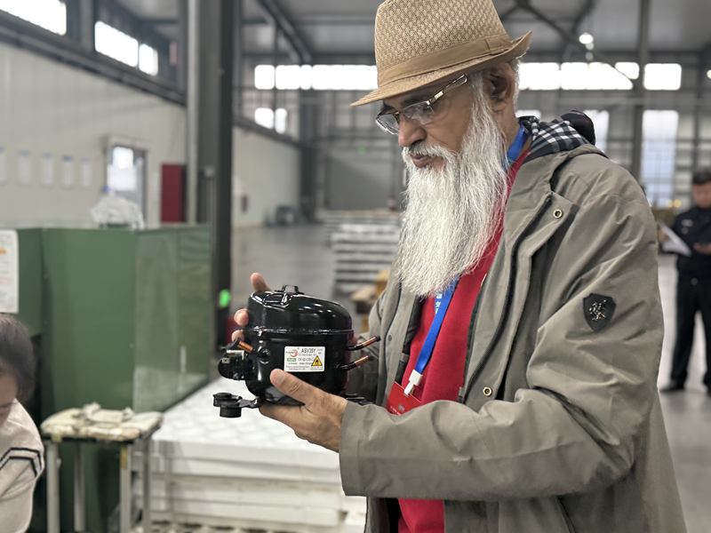 海外采購(gòu)商在阿斯貝拉制冷科技產(chǎn)業(yè)園看壓縮機(jī)。新京報(bào)記者張建林 攝