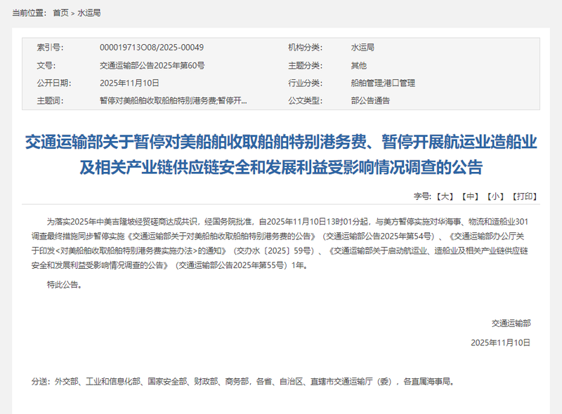 新京報訊 據(jù)交通運輸部消息,為落實2025年中美吉隆坡經(jīng)貿(mào)磋商達成共識,經(jīng)國務院批準,自2025年11月10日13時01分起,與美方暫停實施對華海事、物流和造船業(yè)301調(diào)查最終措施同步暫停實施《交通運輸部關于對美船舶收取船舶特別港務費的公告》(交通運輸部公告2025年第54號)、《交通運輸部辦公廳關于印發(fā)<對美船舶收取船舶特別港務費實施辦法>的通知》(交辦水〔2025〕59號)、《交通運輸部關于啟動航運業(yè)、造船業(yè)及相關產(chǎn)業(yè)鏈供應鏈安全和發(fā)展利益受影響情況調(diào)查的公告》(交通運輸部公告2025年第55號)1年。