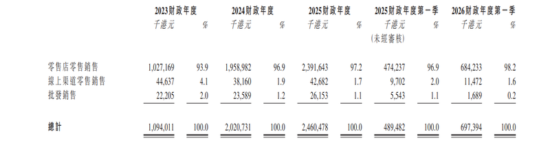 具體來看,在截至2023年3月31日、2024年3月31日和2025年3月31日的三個財年內(nèi),龍豐集團(tuán)來自零售店的收入分別約10.27億港元、19.59億港元和23.92億港元,收入占比分別約93.9%、96.9%和97.2%。到了2026財年第一季度,零售店的銷售收入達(dá)6.84億港元,收入占比進(jìn)一步提升至98.2%。