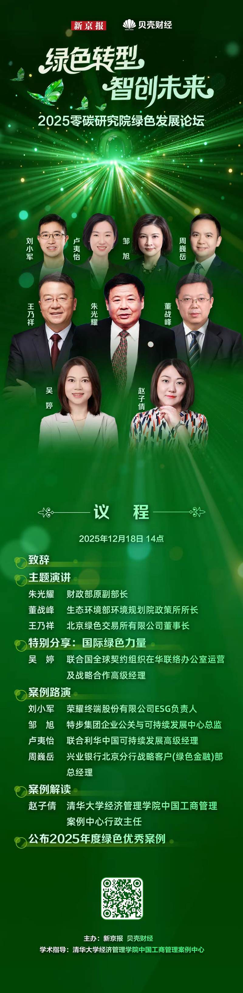 在全面貫徹“十五五”規(guī)劃建議宏偉藍(lán)圖、深入推動(dòng)發(fā)展方式綠色轉(zhuǎn)型的關(guān)鍵節(jié)點(diǎn),新京報(bào)零碳研究院將于12月18日在北京舉辦2025年度綠色發(fā)展論壇,并以“綠色轉(zhuǎn)型,智創(chuàng)未來”為主題,匯聚政、產(chǎn)、學(xué)、研各方智慧,深入探討新型能源體系建設(shè)、碳市場機(jī)制優(yōu)化、產(chǎn)業(yè)低碳轉(zhuǎn)型等核心議題,分享前沿實(shí)踐與創(chuàng)新成果,為構(gòu)建人與自然和諧共生的現(xiàn)代化貢獻(xiàn)智慧與方案。