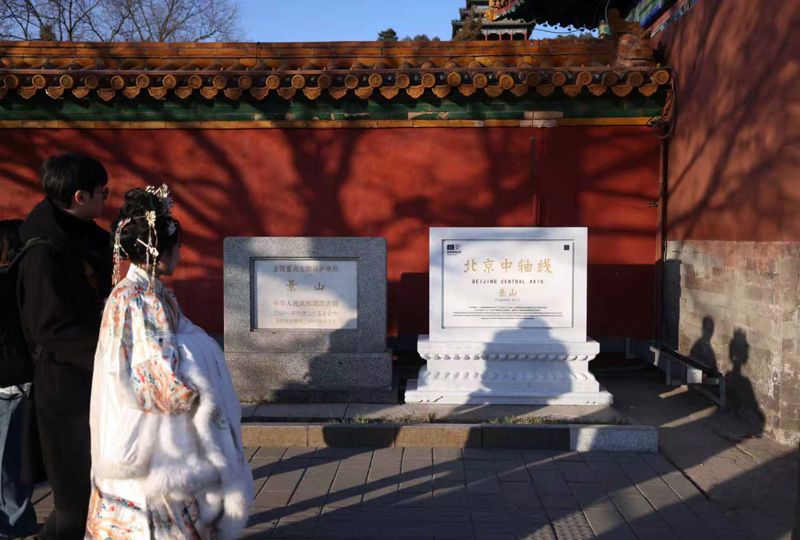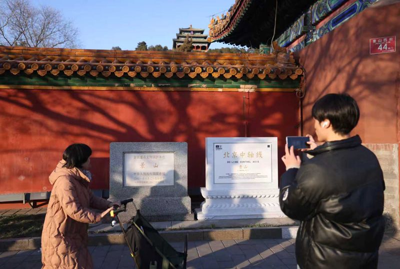 12月16日,游客爭相與北京中軸線世界遺產(chǎn)碑合影。當(dāng)日,北京中軸線世界遺產(chǎn)碑(景山)正式亮相景山公園南門。