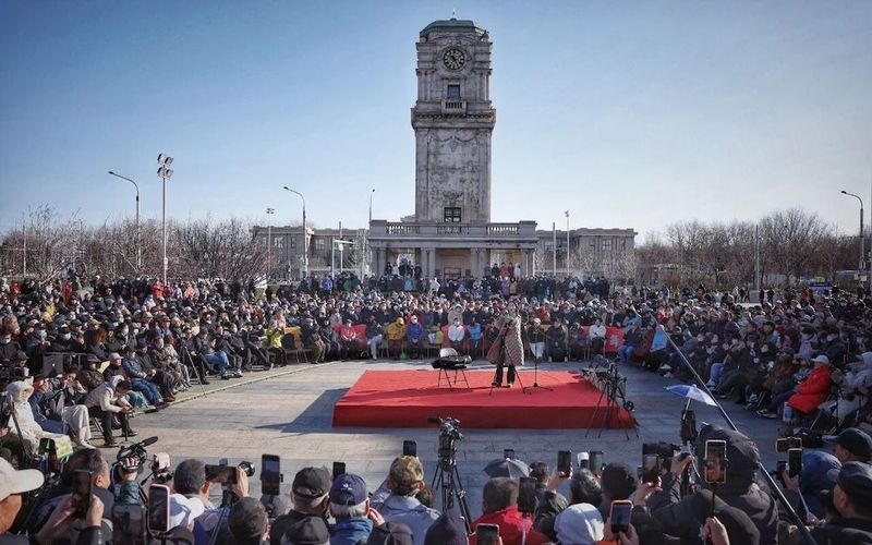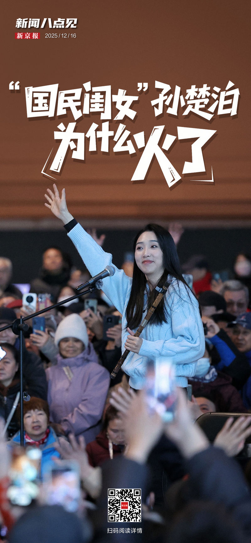 演出開(kāi)始前,舞臺(tái)已經(jīng)被圍了里三圈外三圈。10點(diǎn)整,孫楚泊穿著一身休閑大衣,帶著簡(jiǎn)單的設(shè)備走進(jìn)人群。一路上,不停有觀眾跟她打招呼,喊她“孫老師”“閨女”“大侄女”,她都笑著回應(yīng)。